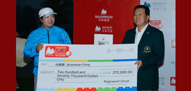 進(jìn)入最后一洞,490碼,五桿洞,華彬簽約球員馮珊珊還落后一桿。在這樣巨大的壓力之下,她打出了生涯最精彩的好球之一。224碼之外,她3號(hào)木強(qiáng)攻果嶺,小球撞上旗桿,留下4英尺老鷹推。她推入了那個(gè)推桿,最后一輪打出68桿,低于標(biāo)準(zhǔn)桿5桿,四輪成績(jī)?yōu)?66桿(70-64-64-68),低于標(biāo)準(zhǔn)桿26桿,反超領(lǐng)先在前的世界第三史黛西-劉易斯,在巨大的歡呼聲中奪取了北京歷史上第一場(chǎng)LPGA巡回賽。毫無(wú)疑問(wèn),這對(duì)馮珊珊來(lái)說(shuō),是雙喜臨門(mén),她在賽事開(kāi)始之前與華彬集團(tuán)簽約,而她立即在自己的主場(chǎng)奪取冠軍,回報(bào)了華彬集團(tuán)。