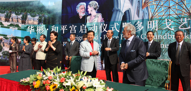 2013年10月8日,“華彬?和平宮啟動儀式暨多明戈藝術(shù)博物館簽約儀式”在華彬莊園的白宮酒店隆重舉行。華彬文化基金會秘書長沈珠女士與歌劇之王、世界三大男高音之一的普拉西多?多明戈先生共同簽署了合作協(xié)議,華彬集團董事長嚴彬博士等人參與了奠基暨簽約儀式。隨后,嚴彬博士和多明戈先生一起放飛了數(shù)百只象征著和平與美好的和平鴿,華彬莊園內(nèi)五彩斑斕的焰火也在此刻四處綻放。