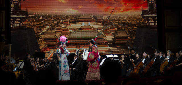 京劇大師梅葆玖先生唯一男旦弟子胡文閣演繹的經(jīng)典曲目《貴妃醉酒》,拉開了這場時(shí)長一個(gè)半小時(shí)音樂會(huì)的大幕。自上世紀(jì)30年代以來,在近百年的發(fā)展時(shí)間里,京劇一直擔(dān)當(dāng)著中國優(yōu)秀經(jīng)典文化輸出的先鋒,并在東西方文化的交流與碰撞中大放光芒,成為西方世界了解東方的精華與代表。著名京胡演奏家燕守平先生帶來的經(jīng)典曲牌《夜深沉》以及傳統(tǒng)京劇選段《四郎探母》、《赤桑鎮(zhèn)》、《楊門女將》等,在經(jīng)過精心演繹后,散發(fā)出了濃烈的東方韻味。上半場的國粹京劇演出,在中國歌劇舞劇院交響樂團(tuán)和華彬文化基金會(huì)京劇樂隊(duì)的共同伴奏下,使東西方文化在這一刻交相輝映。